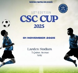 ​സിഡ്‌നി: ഫുട്‌ബോൾ പ്രേമികൾ ആകാംക്ഷയോടെ കാത്തിരിക്കുന്ന കാന്റർബറി സ്പോർട്ടിങ് ക്ലബിന്റെ (CSC) പത്താം വാർഷിക CSC കപ്പ് 2025 നവംബർ 1-ന് സെവൻ ഹിൽസിലെ ലാൻഡൺ സ്റ്റേഡിയത്തിൽ വെച്ച് നടക്കും