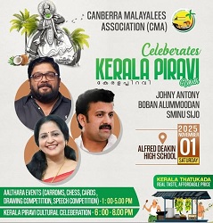 കാൻബെറ: ഓസ്ട്രേലിയയിലെ കാൻബെറ മലയാളി അസോസിയേഷൻ (CMA) 2025-ലെ കേരളപ്പിറവി വിപുലമായി ആഘോഷിക്കുന്നു. മലയാള സിനിമയിലെ പ്രമുഖരായ നടൻമാരും താരങ്ങളുമായ ജോണി ആൻ്റണി, ബോബൻ ആലുമൂടൻ, നടി സ്മിനു സിജോ എന്നിവർ ആഘോഷ പരിപാടികളിൽ അതിഥികളായി പങ്കെടുക്കും.