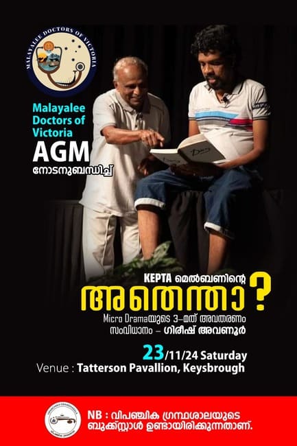 മലയാളി ഡോക്ടേഴ്സ് ഓഫ് വിക്ടോറിയ (MDV) യുടെ ആനുവൽ ജനറൽ മീറ്റിങ്ങിനോടും, ഫണ്ട്റൈസർ പ്രോഗ്രാമിനോടും അനുബന്ധിച്ച് KEPTA മെൽബണിന്റെ “അതെന്താ?”Micro Drama യുടെ 3 -ാമത് അവതരണം ഇന്ന് (23-11-2014) രാത്രി 8 മണിക്ക്