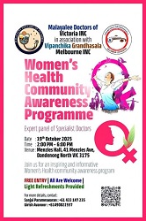 മെൽബൺ: മലയാളി ഡോക്ടേഴ്സ് ഓഫ് വിക്ടോറിയ ഐ.എൻ.സി. (Malayalee Doctors of Victoria INC) വിപഞ്ചിക ഗ്രന്ഥശാല മെൽബൺ ഐ.എൻ.സി.യുമായി (Vipanchika Grandhasala Melbourne INC) ചേർന്ന് വനിതകൾക്കായുള്ള ആരോഗ്യ ബോധവൽക്കരണ പരിപാടി സംഘടിപ്പിക്കുന്നു.